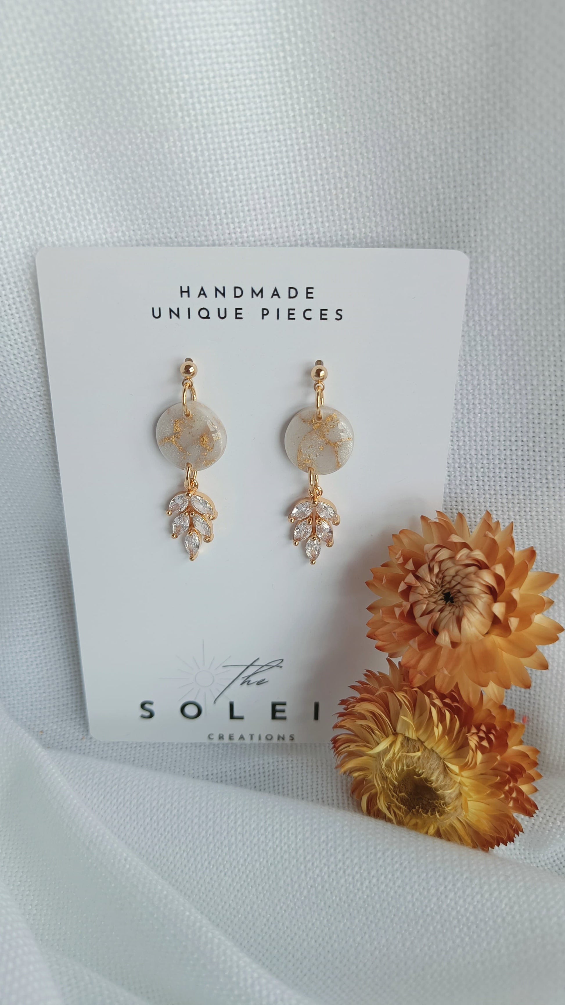 Ein Hauch von Eleganz, eingefangen in Handarbeit: Die Aurora Ohrringe begeistern mit ihrem runden Element aus cremeweißem Polymer Clay, durchzogen von einer feinen, goldenen Marmorierung. Jeder Anhänger ist ein Unikat und spiegelt die Liebe zum Detail wider.