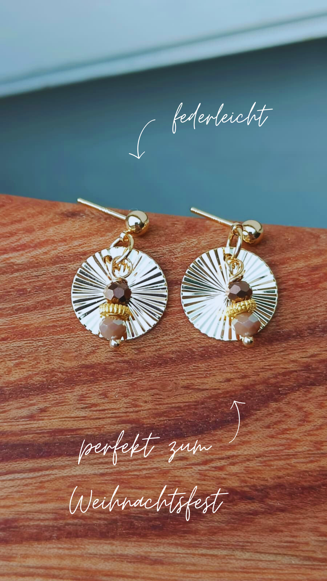 Diese Ohrringe vereinen feine Eleganz mit einem Hauch festlicher Wärme. Die Kombination aus facettierten Glasperlen in warmen Brauntönen und dem strahlend goldenen Plättchen-Design sorgt für einen edlen, aber zugleich natürlichen Look. Perfekt, um deinem Weihnachtsoutfit ein glänzendes Finish zu verleihen – oder einfach, um deinem Alltag einen Hauch von Festlichkeit zu schenken.