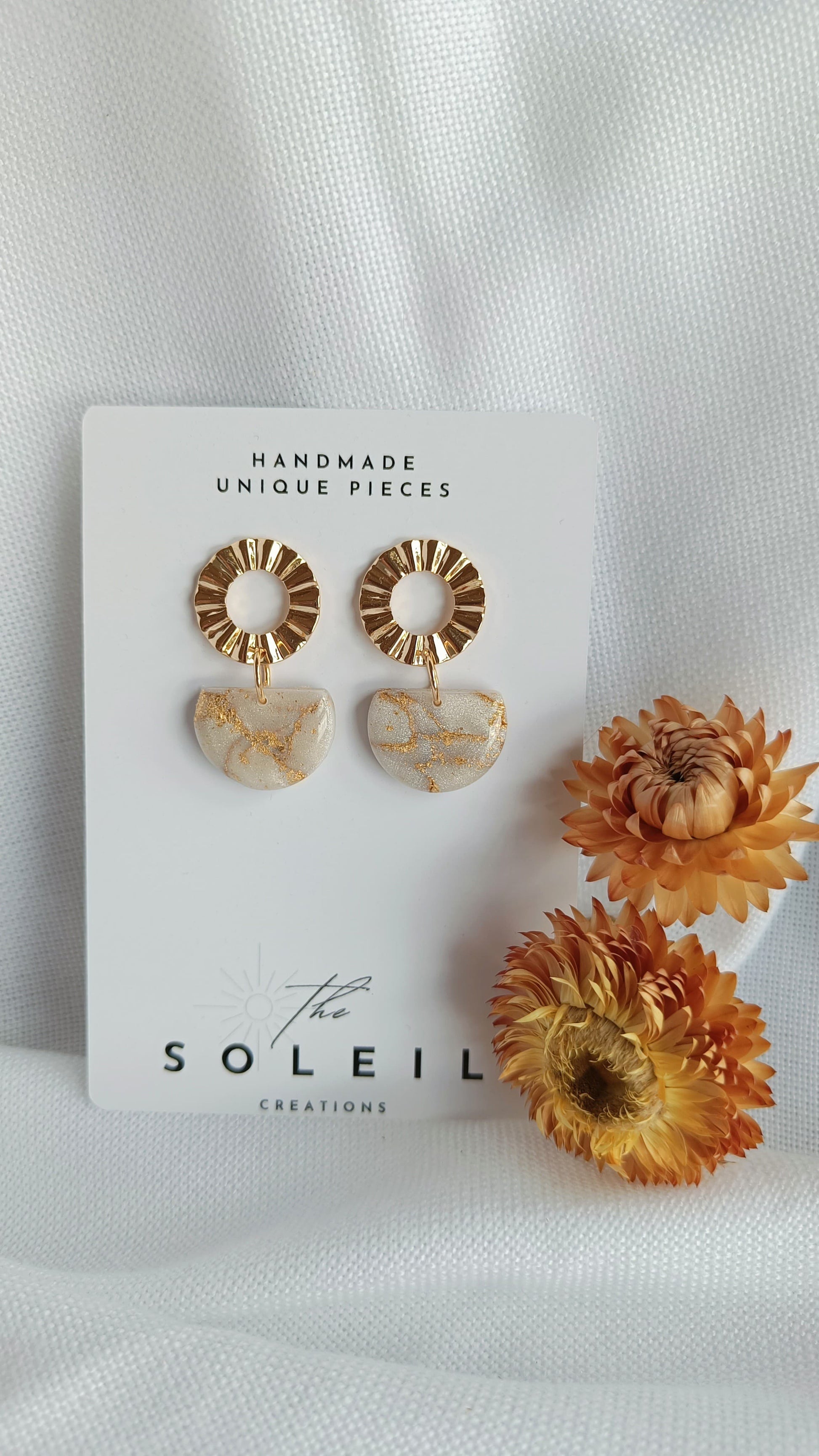 Stilvolle weiße Ohrringe mit dezenten goldenen Details – sorgfältig von Hand gefertigt aus hochwertigem Polymer Clay. Die vergoldeten Edelstahlbügel sorgen für angenehmen Tragekomfort und sind besonders hautverträglich. Ihr ultraleichtes Design macht sie zur perfekten Wahl für Hochzeiten, Feiern und besondere Momente – elegant im Look, sanft am Ohr. Ein harmonisches Zusammenspiel aus moderner Eleganz und alltagstauglichem Komfort.