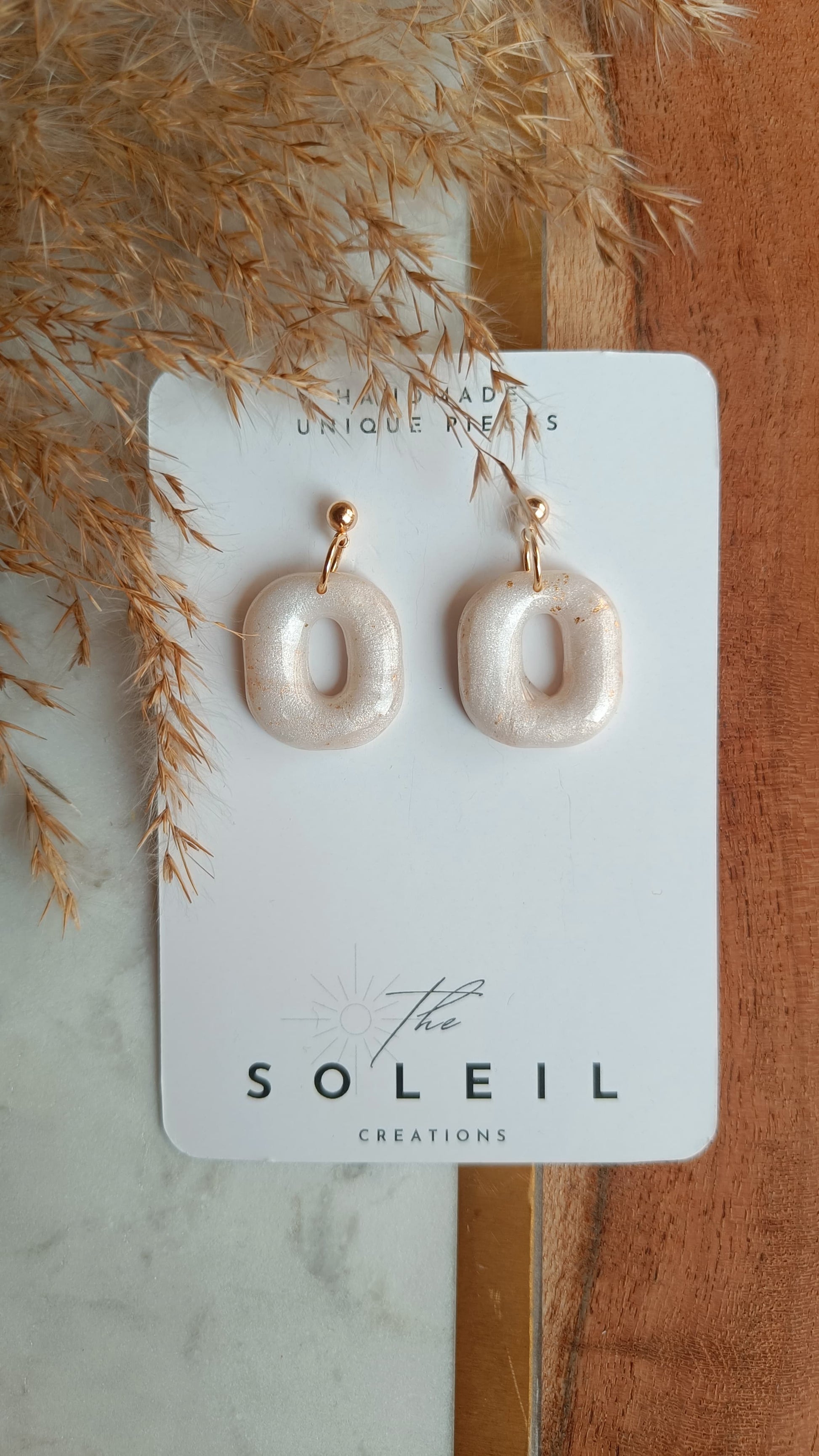 Diese handgefertigten Ohrringe vereinen moderne Schlichtheit mit einem sanften Perlglanz. Die ovale Form mit offener Mitte erinnert an natürliche Kiesel oder kleine Monde – unregelmäßig, lebendig und voller Charakter. Der schimmernde Champagnerton mit feinen Goldakzenten verleiht ihnen eine elegante Leichtigkeit, die sowohl im Alltag als auch zu besonderen Anlässen perfekt passt.