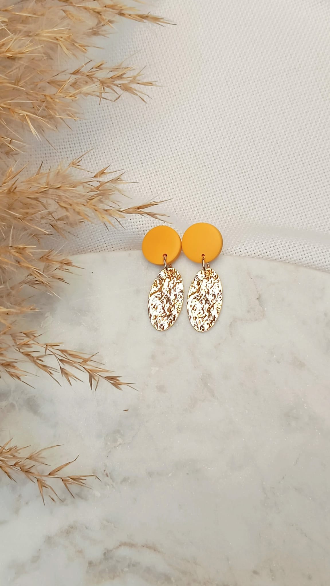 Die Ohrringe Celine vereinen sonnige Lebensfreude mit natürlicher Eleganz. Die warme sonnengelbe Oberseite bringt Farbe und Leichtigkeit in jedes Outfit, während die goldenen, organisch geformten Anhänger mit ihrer gehämmerten Struktur das Licht wunderschön reflektieren und einen Hauch von Extravaganz versprühen.