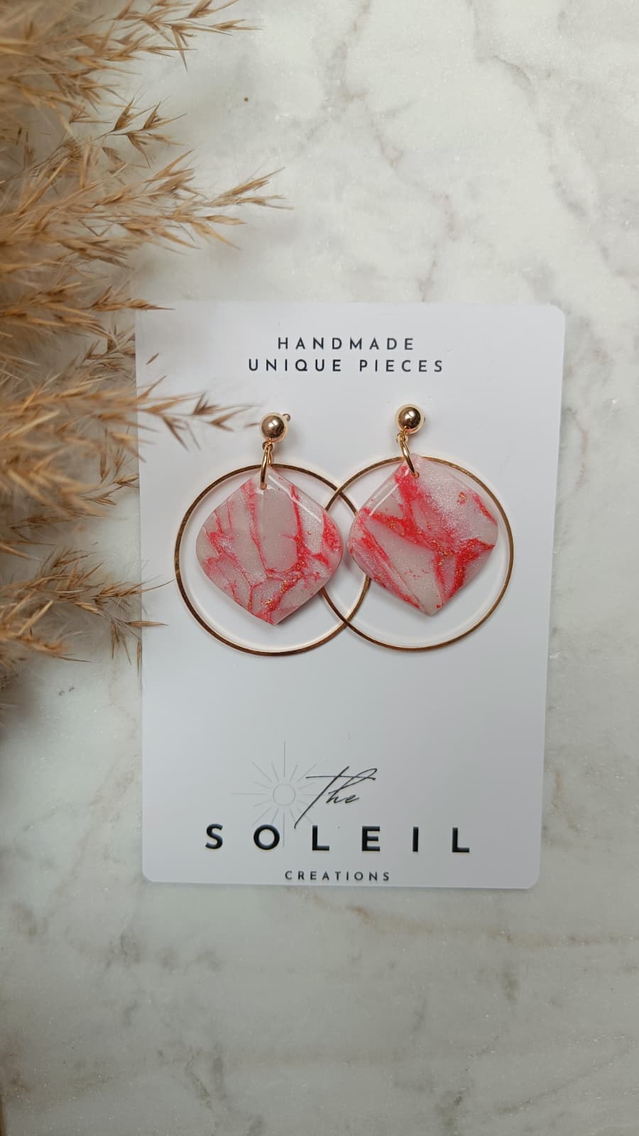 Die runden, vergoldeten Creolen fassen das rosé-rote Marmorplättchen wie ein Rahmen ein Kunstwerk. Sanftes Rosé verschmilzt mit kräftigem Korallrot und feinen Goldpigmenten – ein Look wie gemalt.