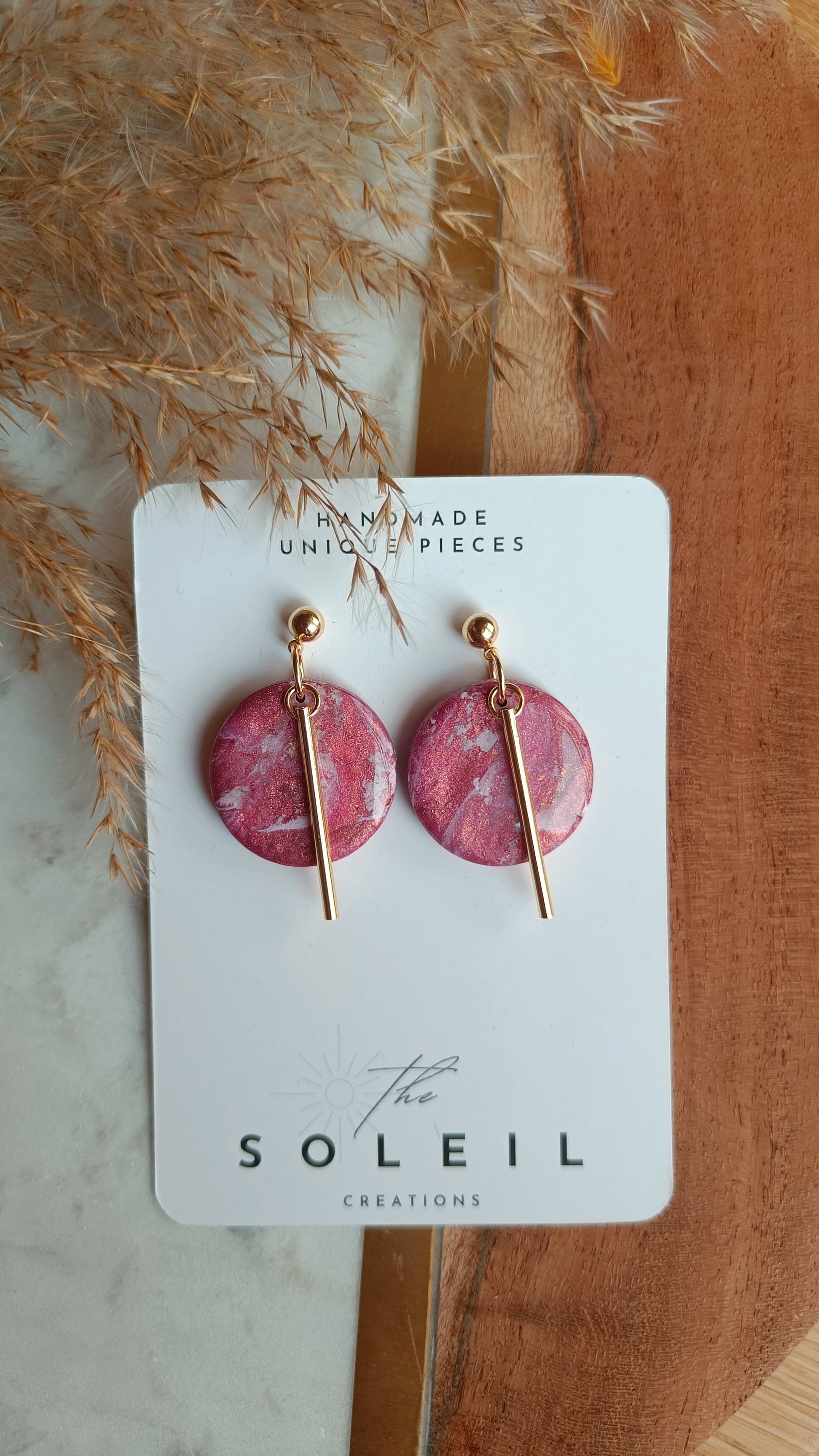 Diese Ohrringe verbinden die runde, handgemachte Scheibe in marmoriertem Beerenrot mit einem schlichten, goldenen Stab. Das Ergebnis: Ein spannender Kontrast zwischen organischer Form und klarer Linie – harmonisch, mutig und absolut zeitgemäß. Die feinen Glitzereffekte im Clay fangen das Licht ein und machen jeden Look besonders.