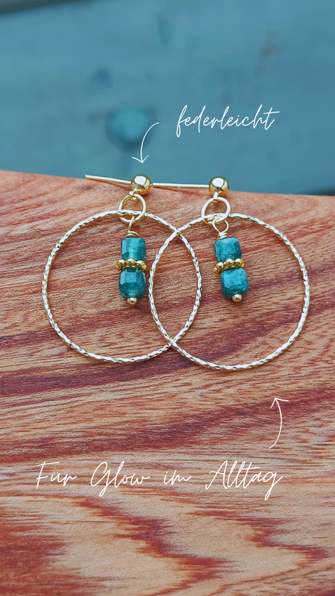Die Ohrringe strahlen Leichtigkeit und Eleganz aus – ein filigraner, gehämmerter Kreis trifft auf zwei schimmernde Glasperlen in edlem Türkisblau. Goldene Zwischenelemente setzen zarte Akzente und lassen die Farben noch intensiver leuchten. Der Look: zeitlos, feminin und voller Energie.