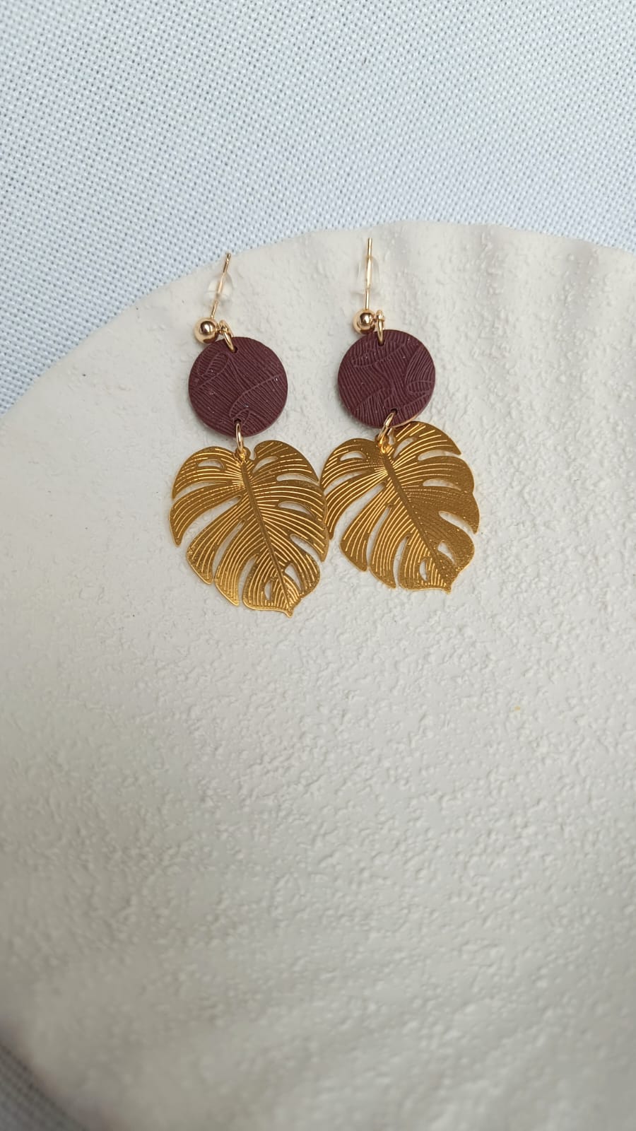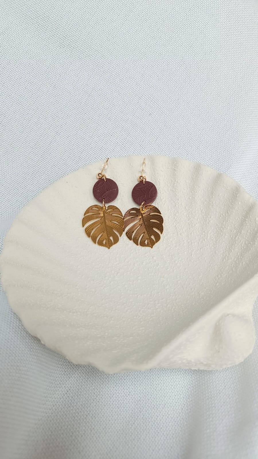 Die Golden Jungle Ohrringe vereinen strukturierte, tiefrote Kreise mit filigranen goldenen Monstera-Blättern – ein kraftvoller Mix aus natürlicher Inspiration und moderner Boho-Ästhetik.
