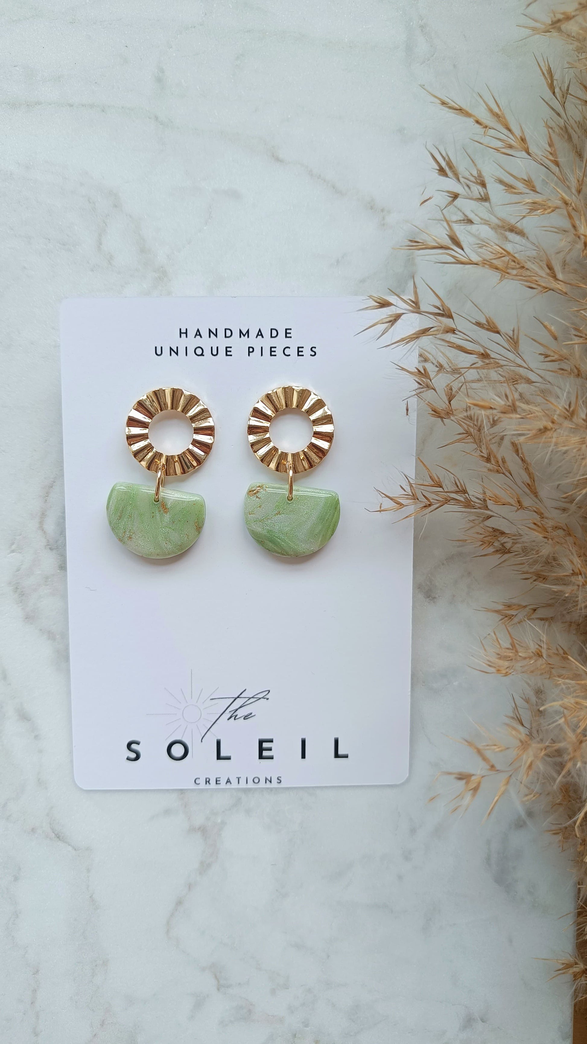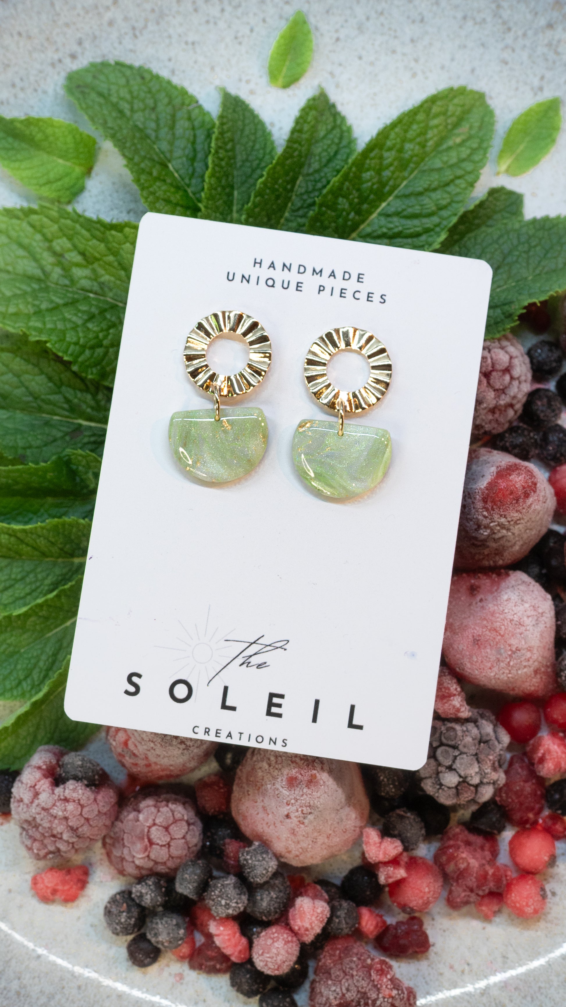 Mint Mirage vereint Leichtigkeit und Eleganz in einem verspielten Design. Die halbmondförmigen Anhänger in zartem Mintgrün mit feinen goldenen Einschlüssen erinnern an tanzende Lichtreflexe in der Natur. Die auffälligen goldenen Kreolenstecker sorgen für einen Hauch Glamour und machen diese Ohrringe zu einem echten Hingucker – ideal für sonnige Tage und besondere Momente.