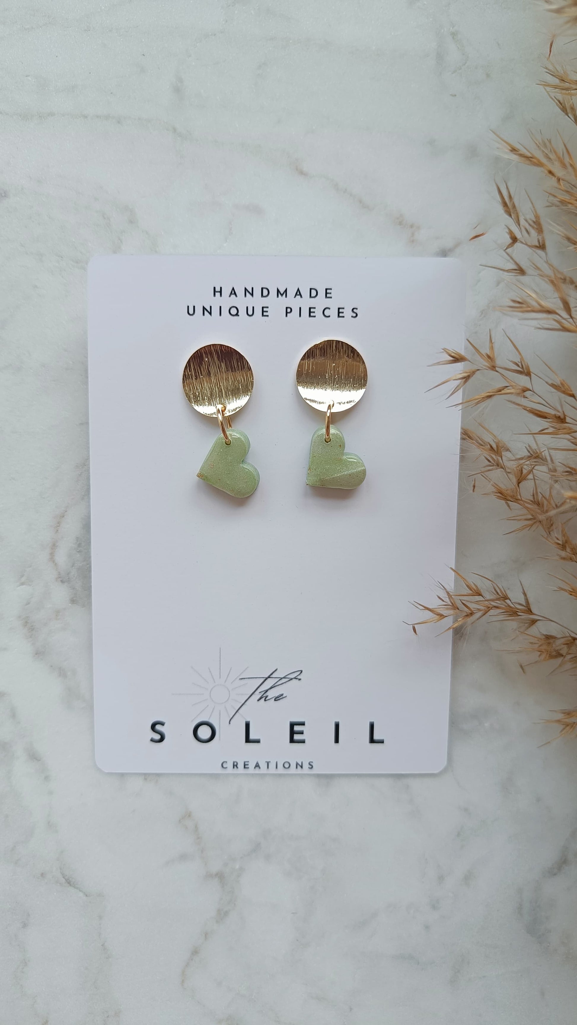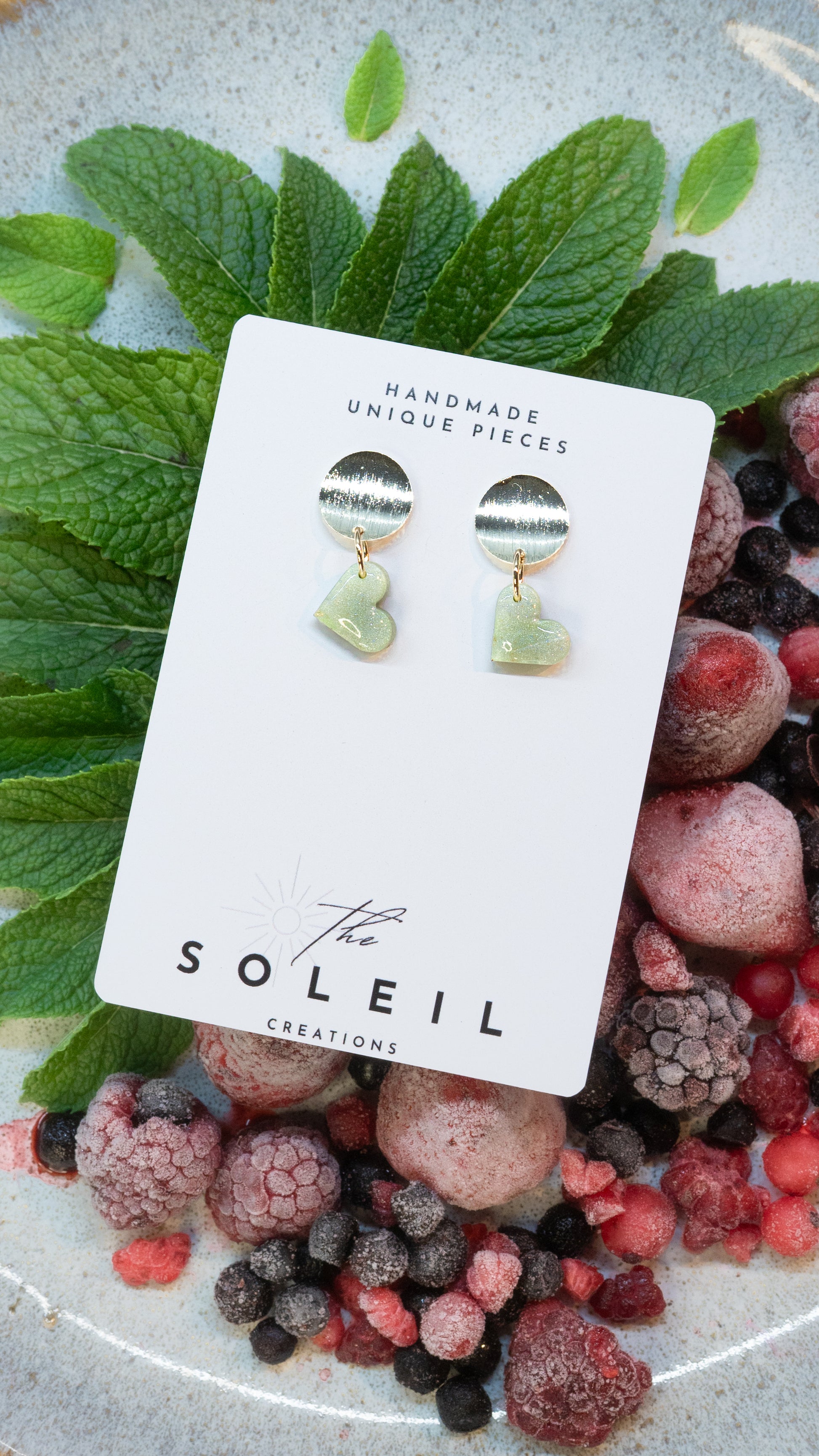 Minty Love ist eine Liebeserklärung an dich selbst – zarte grüne Herzen, handgeformt aus schimmerndem Polymer Clay, kombiniert mit goldfarbenen, strukturierten Steckern. Dieses Modell vereint Leichtigkeit, Eleganz und verspielten Charme in einem Schmuckstück.