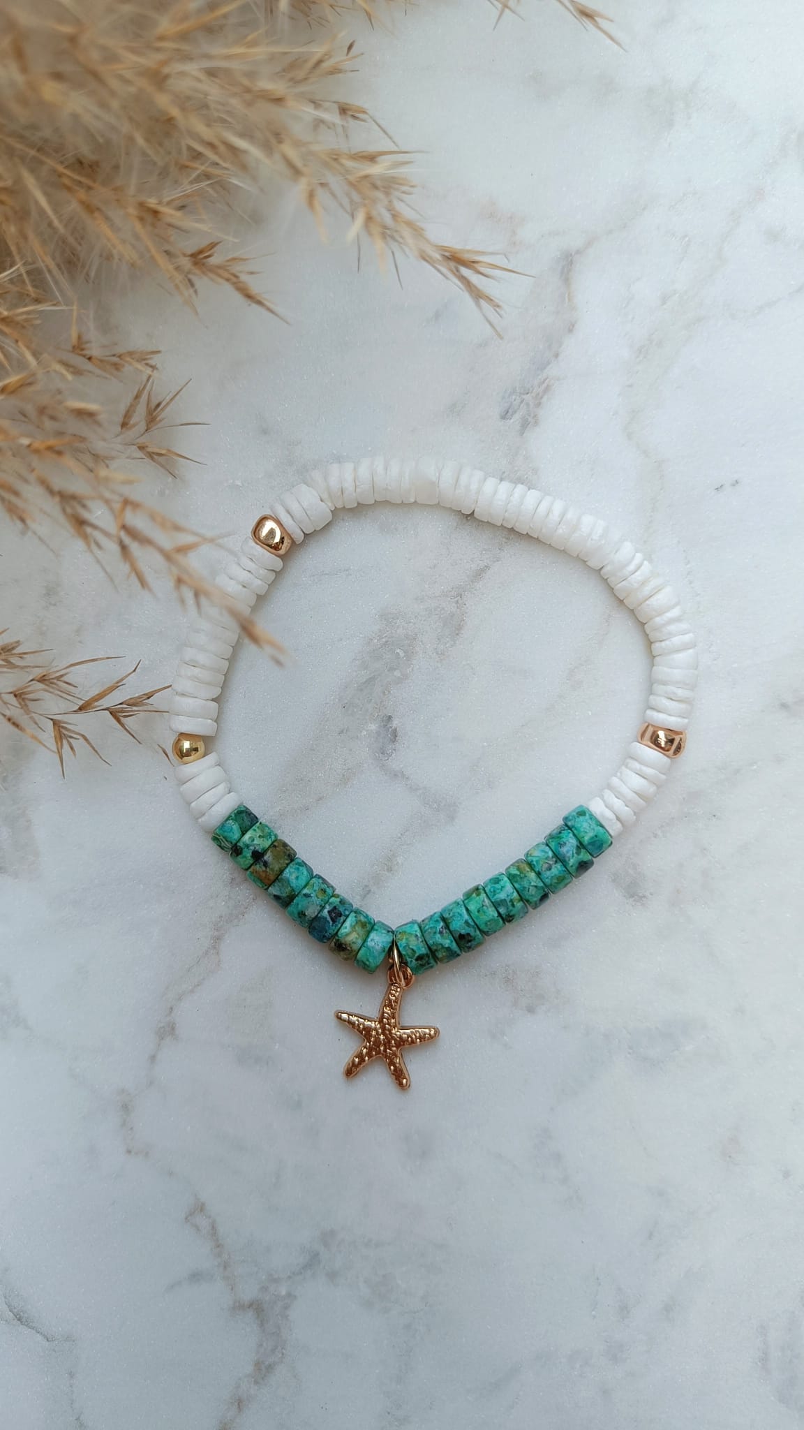 Ocean Breeze – ein natürliches Schmuckstück, das Erdung, Leichtigkeit und glänzende Akzente vereint. Die zarten Muschelperlen bringen sommerliche Frische ans Handgelenk, während afrikanisches Kiefernholz und Hämatit-Perlen für Tiefe und Stabilität sorgen. Abgerundet wird das Design durch vergoldete Elemente, die einen Hauch von Eleganz versprühen.