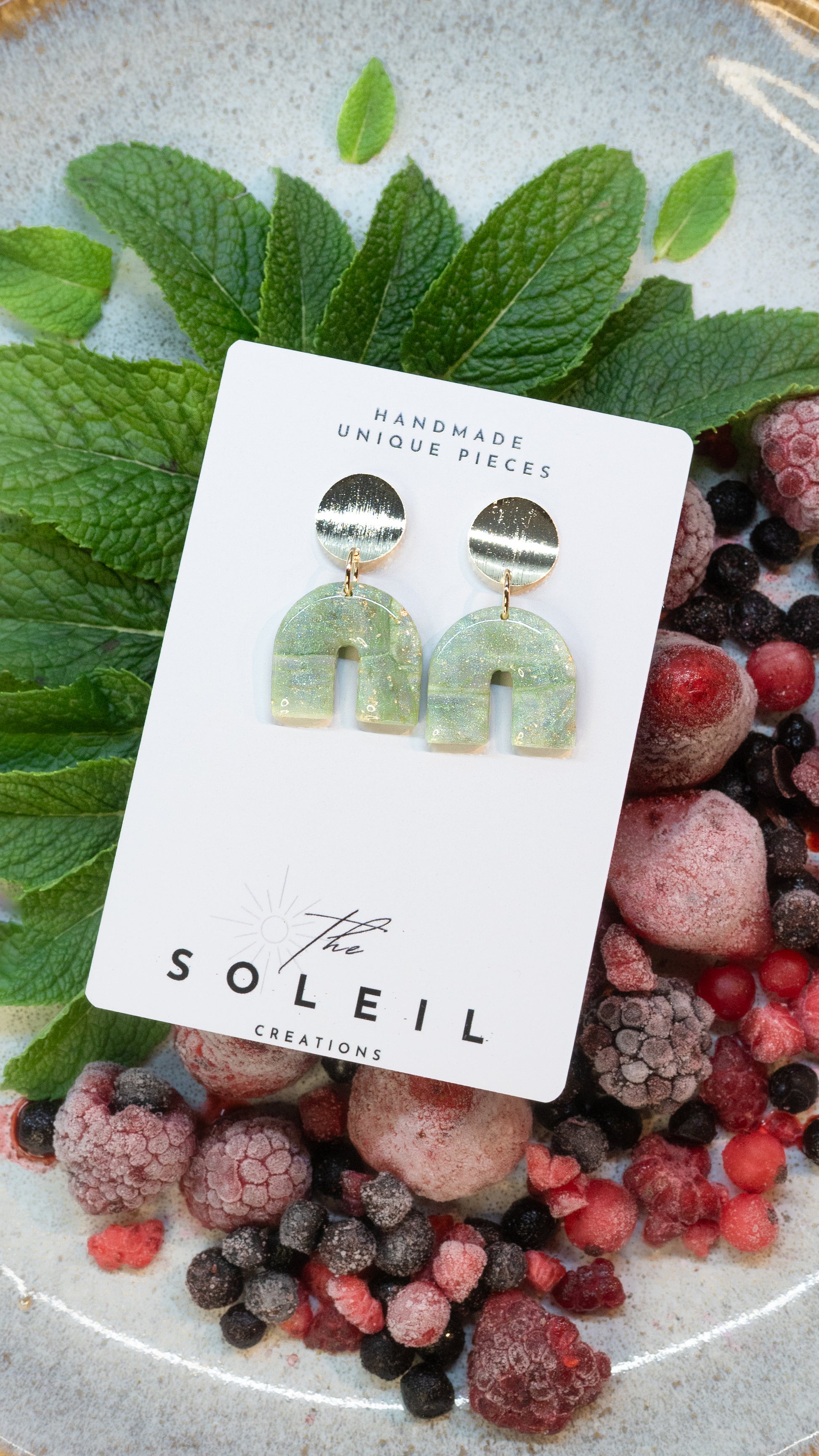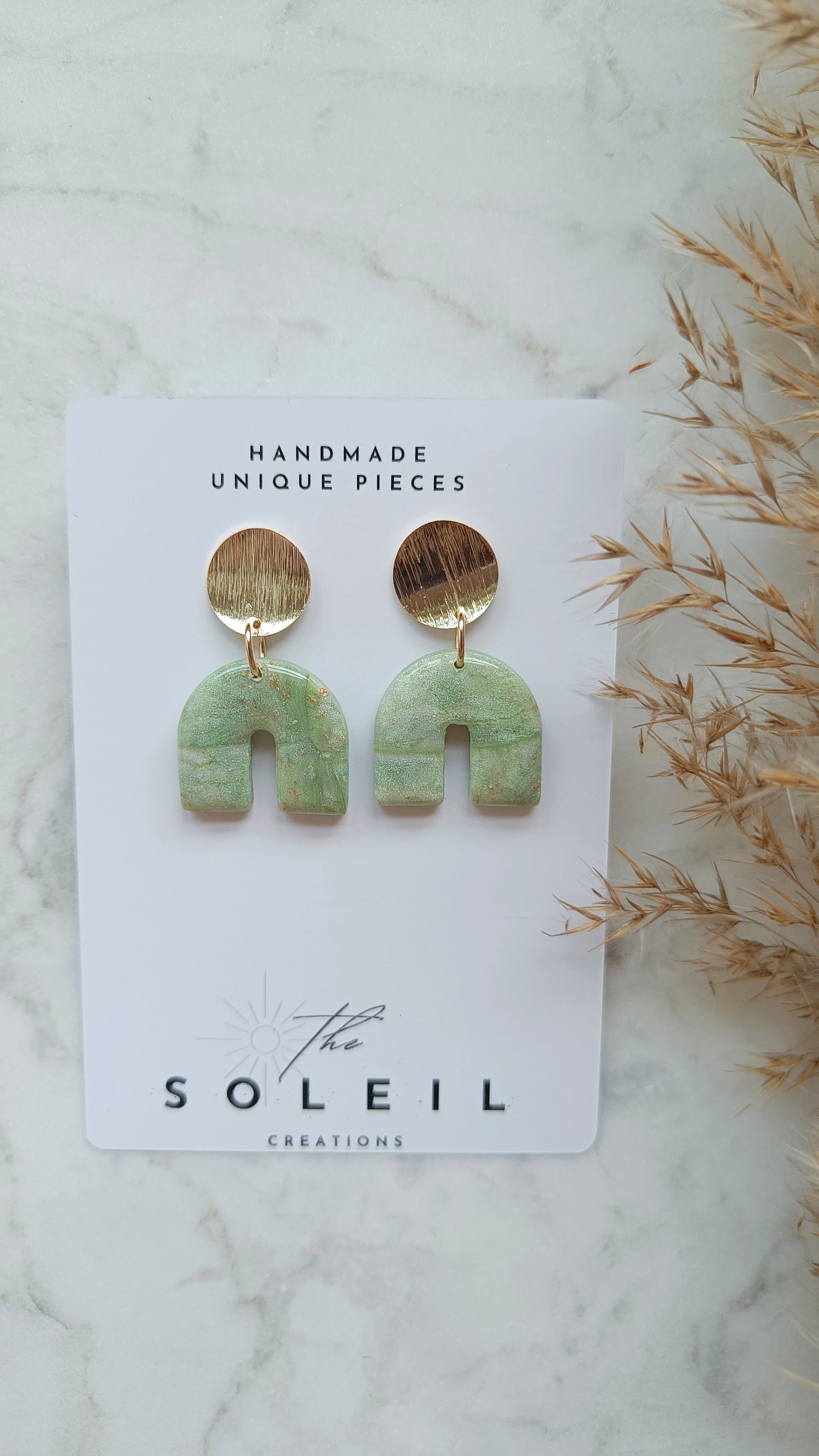 Die Ohrringe Sage Arch vereinen klare Formen mit natürlicher Eleganz. Der mintgrüne Bogen erinnert an weiche Hügel oder symbolische Tore – ein Zeichen für neue Wege und inneres Wachstum. Der strukturierte goldene Kreis bildet einen stilvollen Kontrast zur soften Form und bringt einen edlen Akzent ins Spiel.