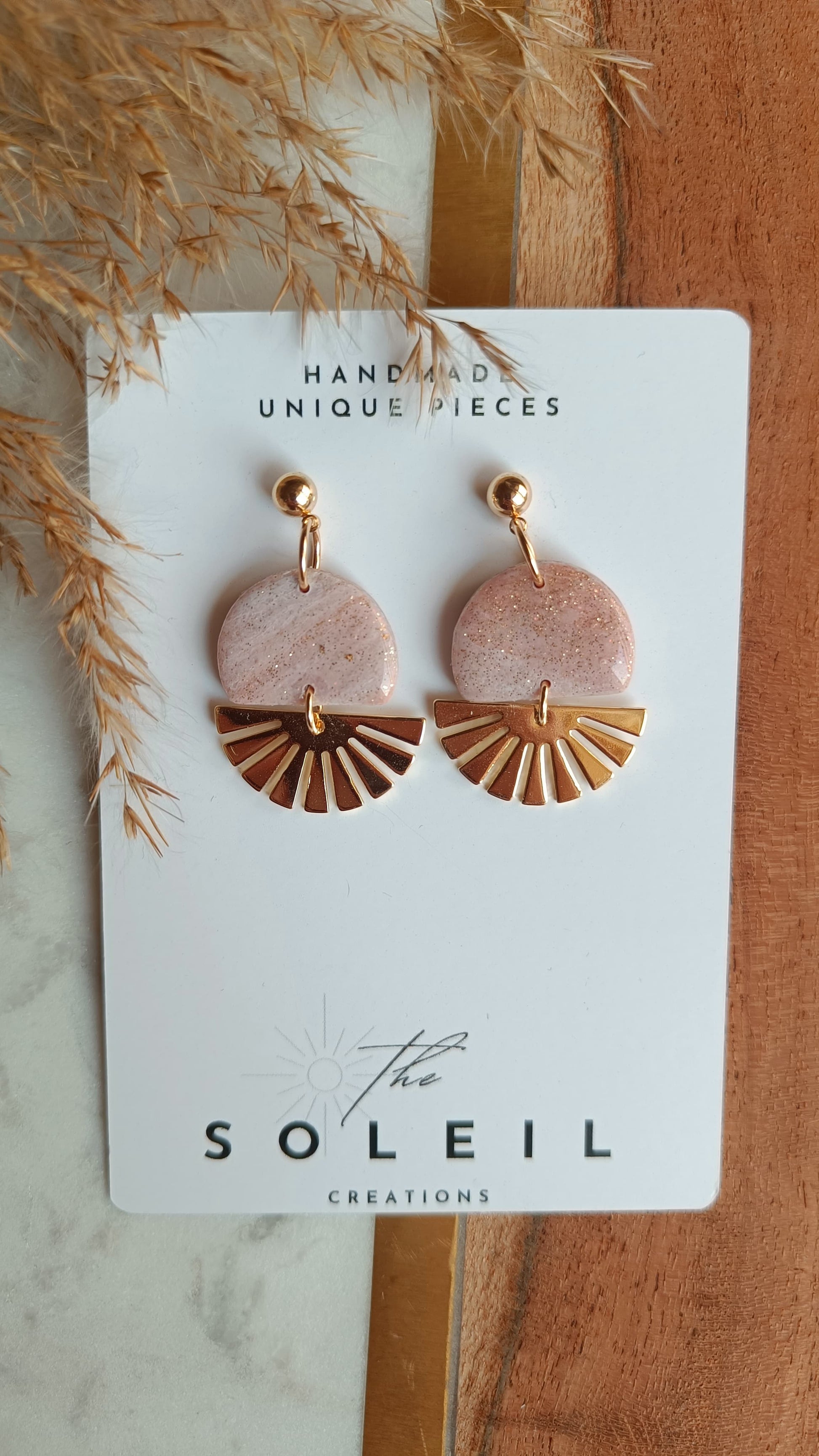 Diese bezaubernden Ohrringe in zartem Rosé mit goldenen Glitzereffekten erinnern an den ersten Sonnenstrahl am Morgen. Das halbrunde Element aus handgefertigtem Polymer Clay wird von einem goldenen Sonnenmotiv ergänzt, das für ein stilvolles, leichtes Statement sorgt. Sie passen perfekt zu hellen Outfits, Sommerkleidern oder als zarter Akzent in festlichen Momenten.