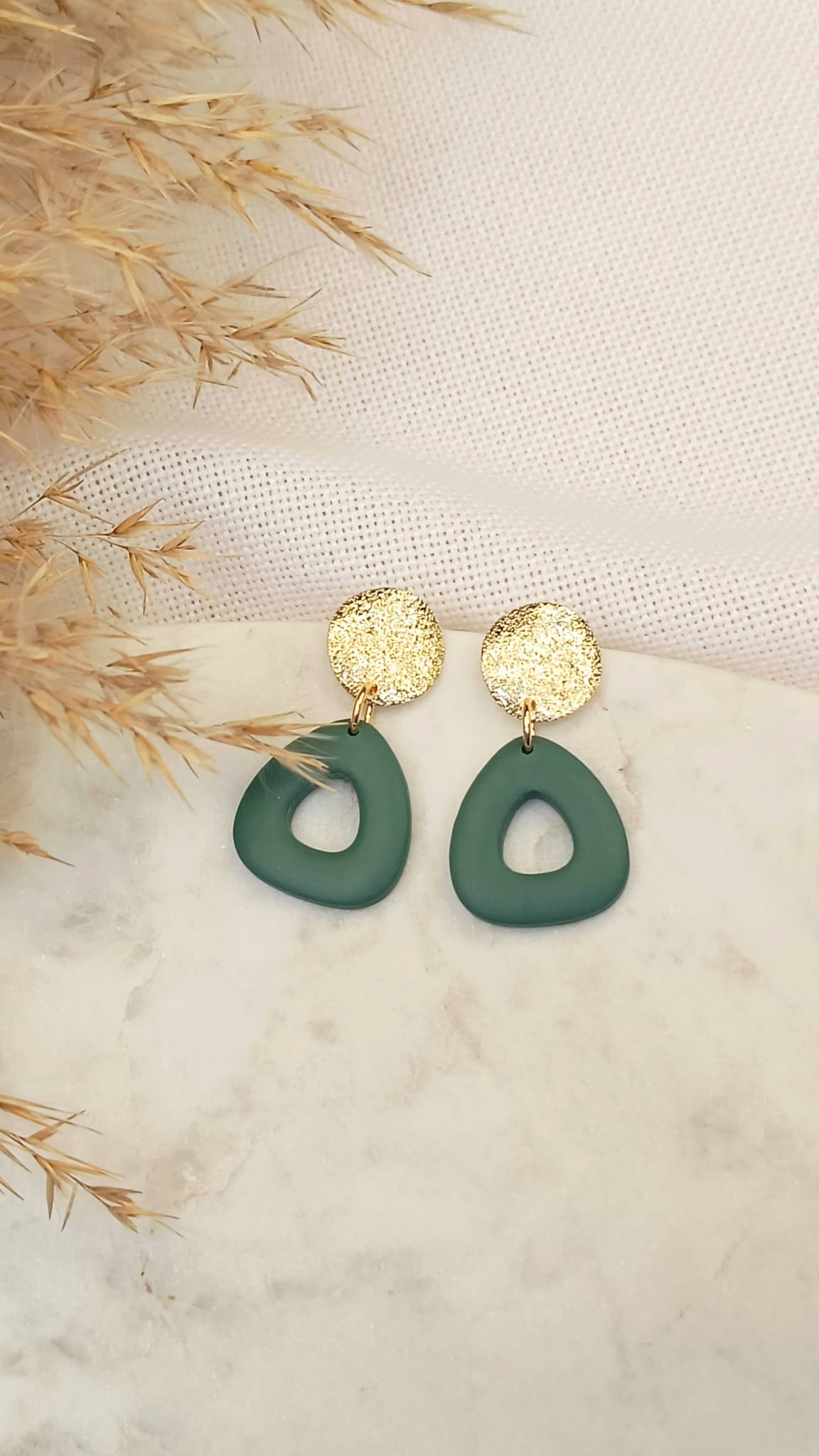 Die Ohrringe Tara vereinen moderne Formgebung mit einem Hauch von Boho-Chic. Das organisch geformte Dreieck in sattem Tannengrün wirkt weich und gleichzeitig ausdrucksstark. Die goldenen, strukturierten Plättchen am Ohrläppchen reflektieren das Licht und verleihen dem Design eine edle Note.