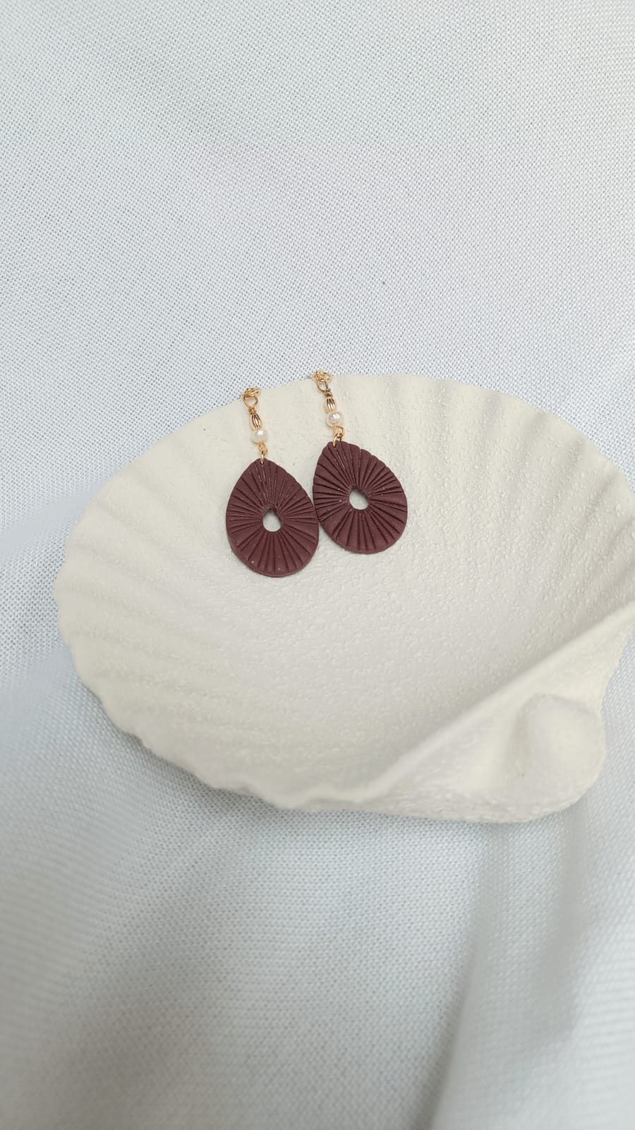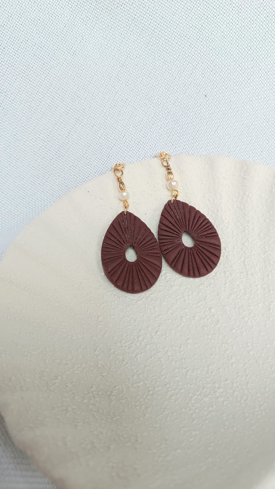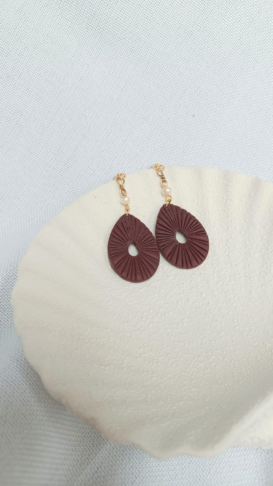 Velvet Pearl ist ein Ausdruck von sanfter Raffinesse – das warme Bordeaux-Rot der Tropfenform harmoniert perfekt mit der zarten Perlenverzierung am Stecker. Die feine Struktur auf der Oberfläche erinnert an Faltenwurf von Stoff oder Sonnenstrahlen – je nach Blickwinkel.